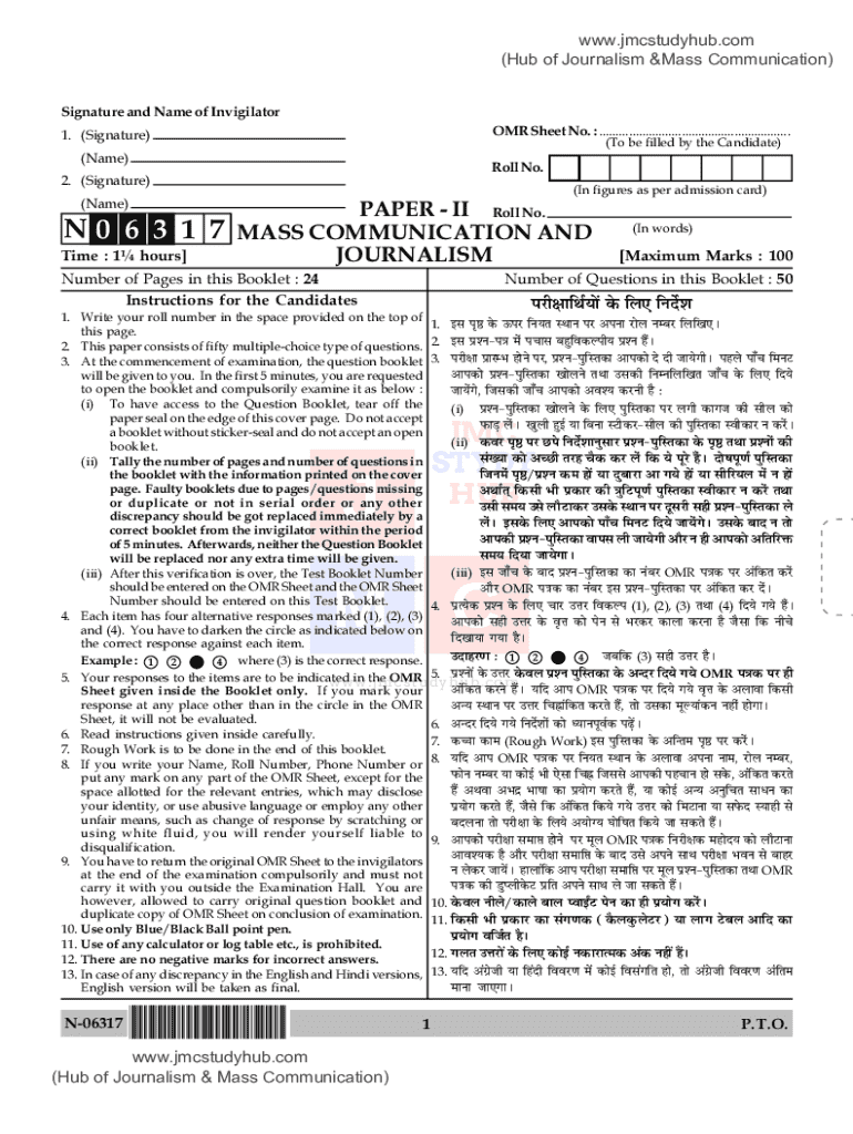www.jmcstudyhub.com (Hub of Journalism &Mass Communication) Signature and Name of Invigilator OMR Sheet No. : ..........................................................1. (Signature)(To be filled by the Candidate)(Name)Roll No.2. (Signature) (Name)N0 6 3 1 7 Time : 1 hours](In figures as per admission card)PAPER II Roll No. MASS COMMUNICATION AND JOURNALISMNumber of Pages in this Booklet : 24 Instructions for the Candidates(In words)[Maximum Marks : 100Number of Questions