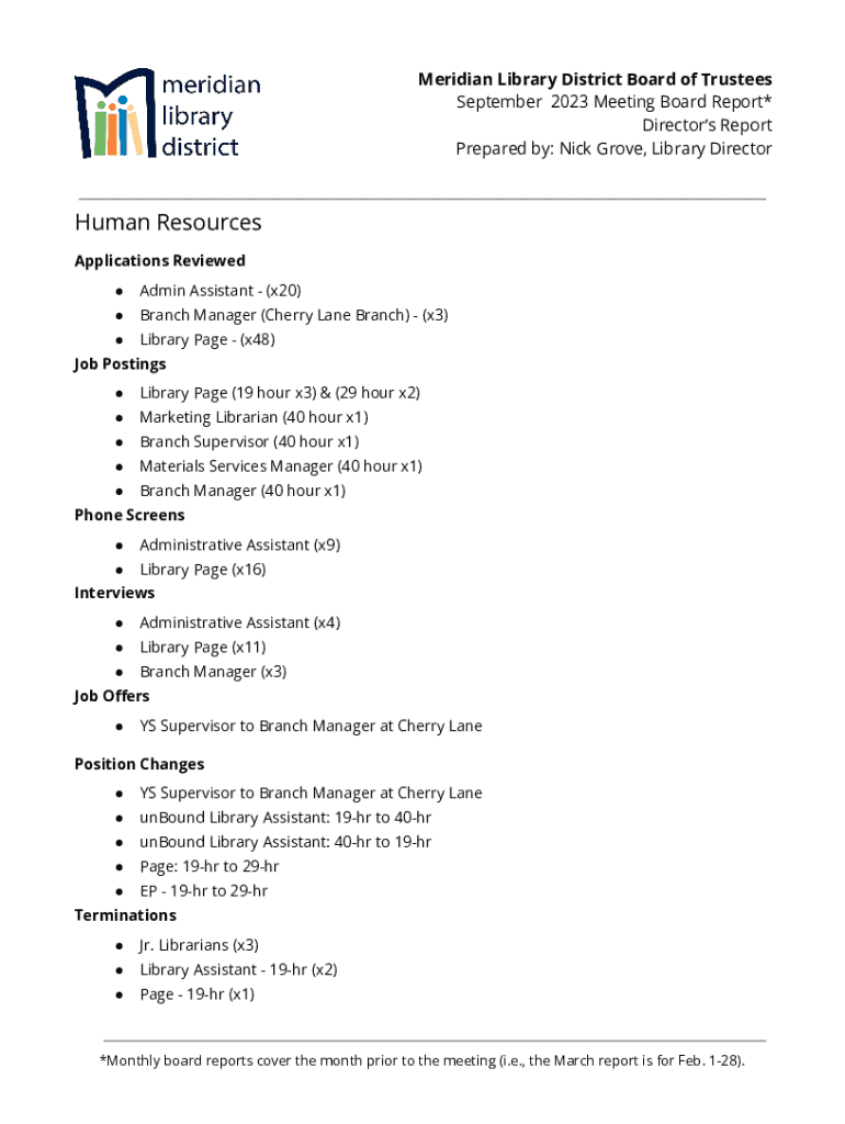 Meridian Library District Board of Trustees September 2023 Meeting Board Report* Directors Report Prepared by: Nick Grove, Library DirectorHuman Resources Applications Reviewed Admin Assistant (x20)Branch