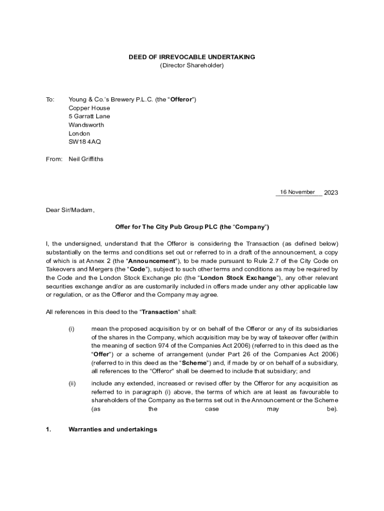 This deed outlines the irrevocable undertaking of Neil Griffiths regarding the acquisition of City Pub Group by Young & Co.\'s Brewery P.L.C., including terms of shares and voting rights.