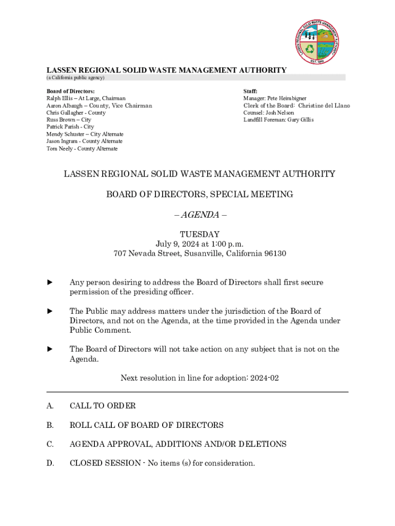 LASSEN REGIONAL SOLID WASTE MANAGEMENT AUTHORITY (a California public agency)Board of Directors: Ralph Ellis At Large, Chairman Aaron Alba ugh County, Vice Chairman Chris Gallagher County Russ Brown