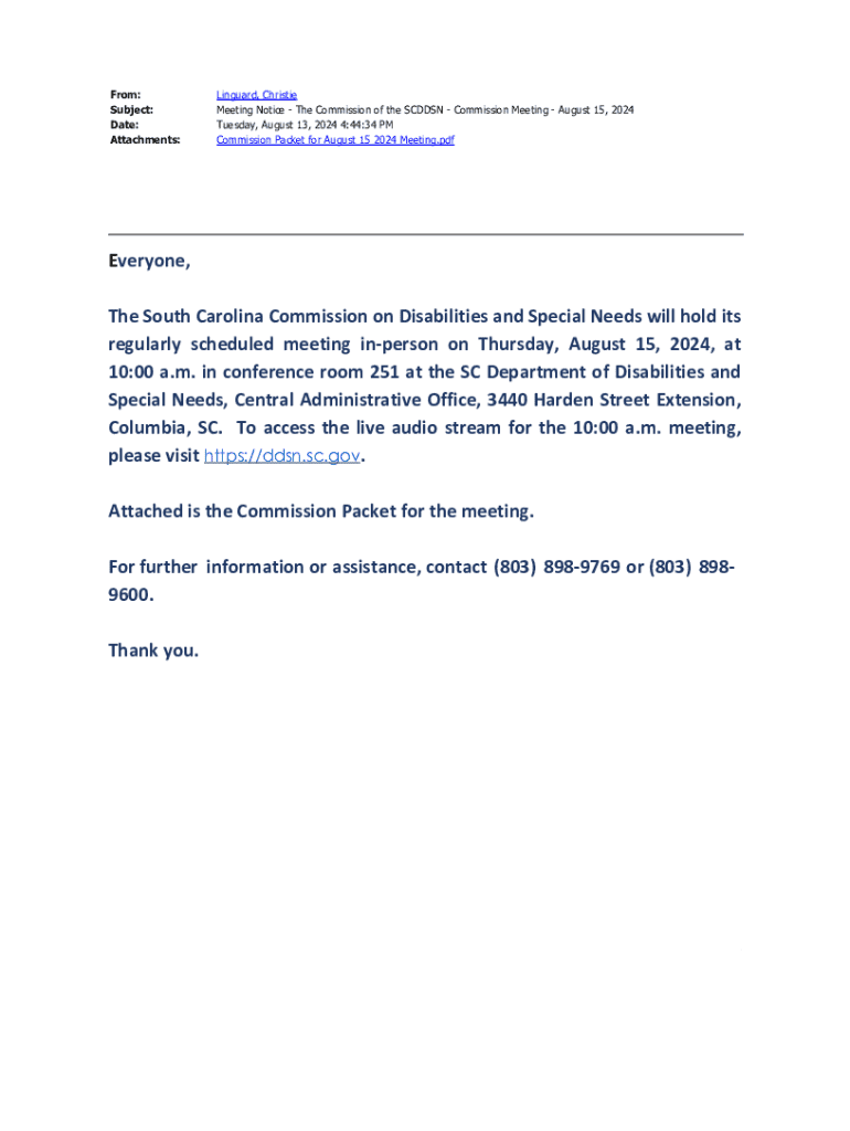 From: Subject: Date: Attachments:Lin guard, Christie Meeting Notice The Commission of the SCD DSN Commission Meeting August 15, 2024, Tuesday, August 13, 2024 4:44:34 PM Commission Packet for August
