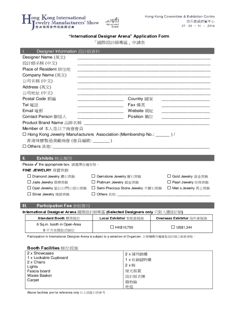 International Designer Arena Application Form I. Designer Information Designer Name () ___ () ___ Place of Resident ___ Company Name () ___ () ___ Address () ___ () ___ Postal Code ___ Country ___