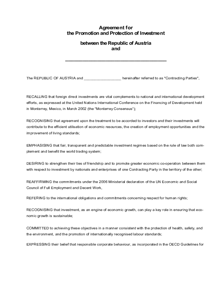 This document outlines the agreement on the promotion and protection of investments between the Republic of Austria and Contracting Party, emphasizing fair treatment and transparency.
