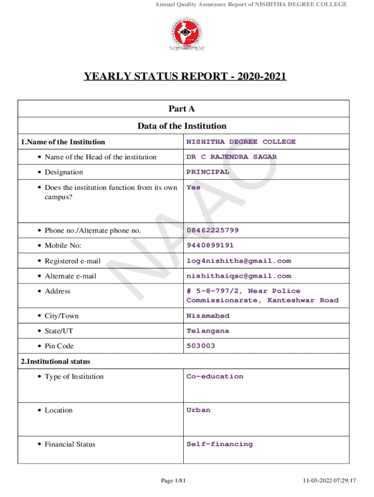 Get the free Annual Quality Assurance Report of NISHITHA DEGREE COLLEGE