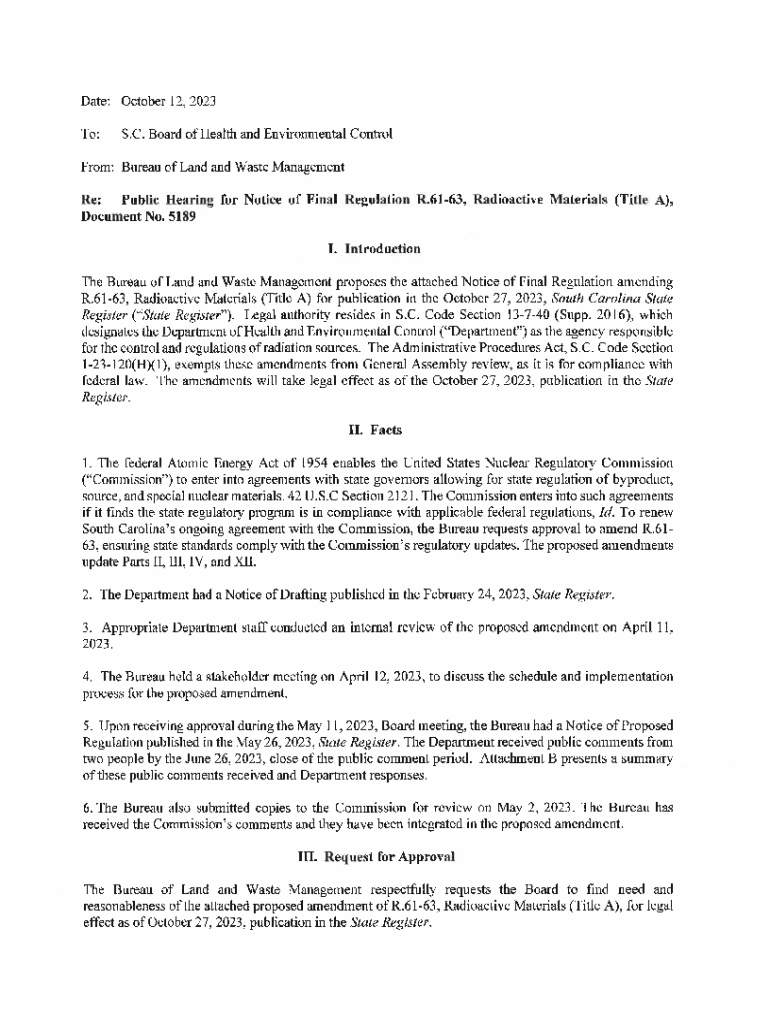 Date:October 12, 2023To:South Carolina Board of Health and Environmental ControlFrom: Division of Public Health Re:Continuation of Public Hearing and Request for Placement of in Schedule III Pursuant to S.C. Code Section 4453160(B). SUMMARYA Public Hearing for the Request for Placement of in Schedule III was conducted before the Board on September 7, 2023. After hearing comments from the public, the Board decided to continue the Public Hearing to the October