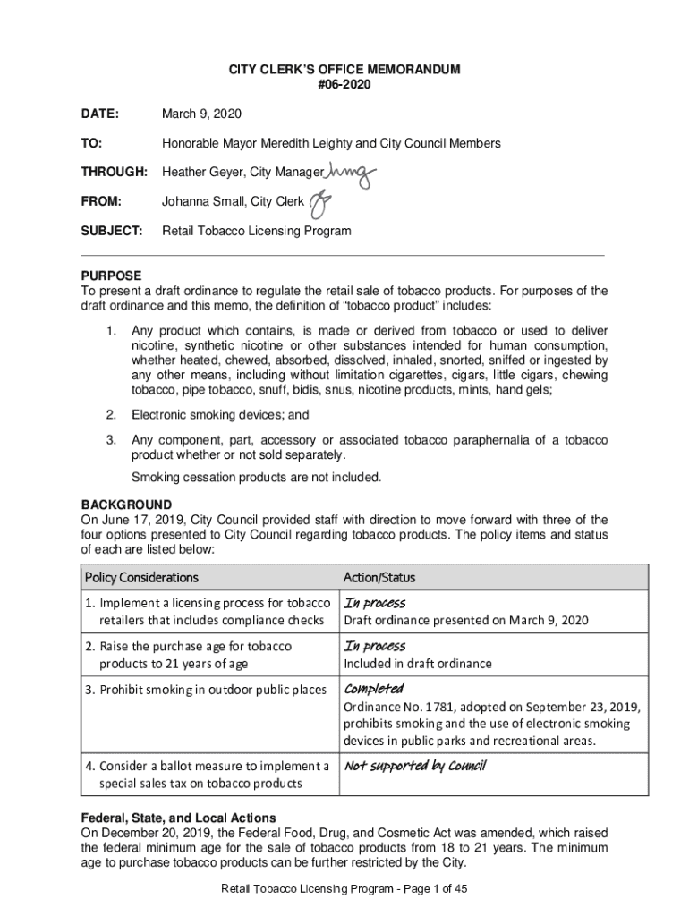 CITY CLERKS OFFICE MEMORANDUM #062020 DATE:March 9, 2020TO:Honorable Mayor Meredith Leighty and City Council MembersTHROUGH:Heather Geyer, City ManagerFROM:Johanna Small, City ClerkSUBJECT:Retail Tobacco Licensing ProgramPURPOSE To present a draft ordinance to regulate the retail sale of tobacco products. For purposes of the draft ordinance and this memo, the definition of tobacco product includes: 1.Any product which contains, is made or derived from tobacco or used