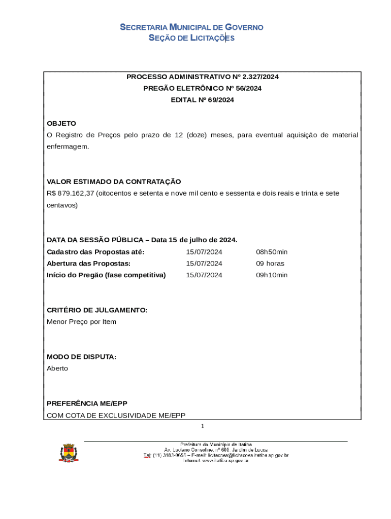 O Registro de Preos pelo prazo de 12 (doze) meses, para eventual aquisio de material enfermagem template instructions
