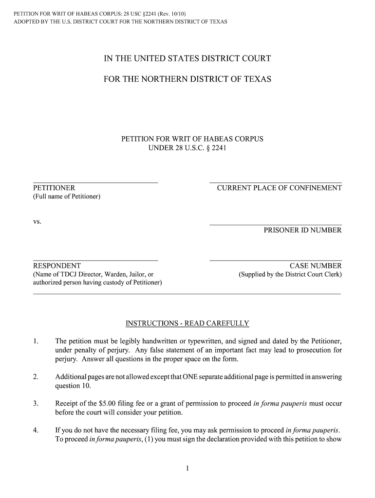 Get the free Petition For A Writ of Habeas Corpus, 28 U.S.C. 2241 - Northern ... - txnd uscourts