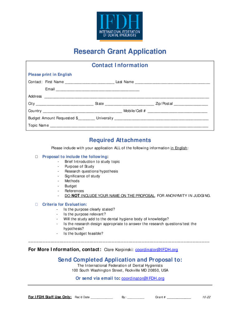 Research Grant Application Contact Information Please print in English Contact: First Name ___ Last Name ___ Email ___ Address ___ City ___ State ___ Zip/Postal ___ Country ___ Mobile/Cell # ___ Budget