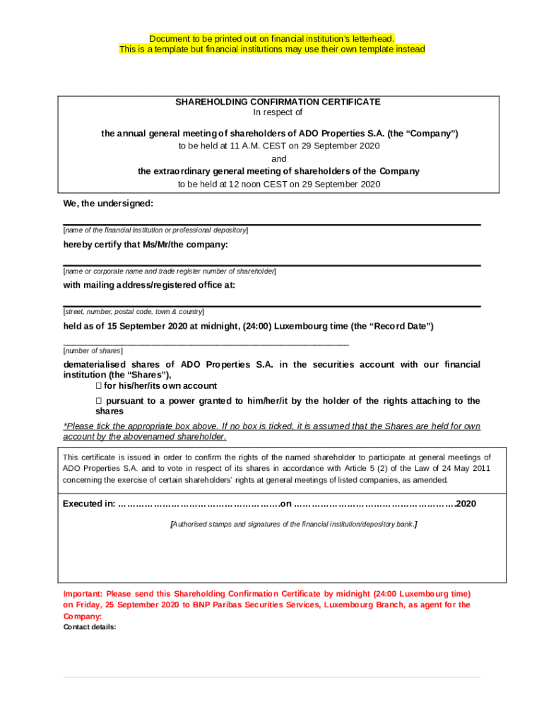Shareholding Confirmation Certificate template instructions