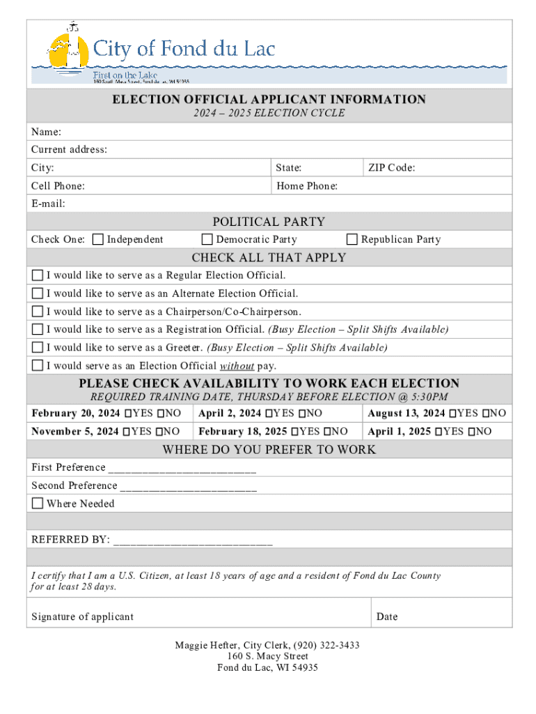 Election official applicant information refers to the details and documentation submitted by individuals seeking positions as election officials. This includes personal information, qualifications, and any relevant history related to election work.