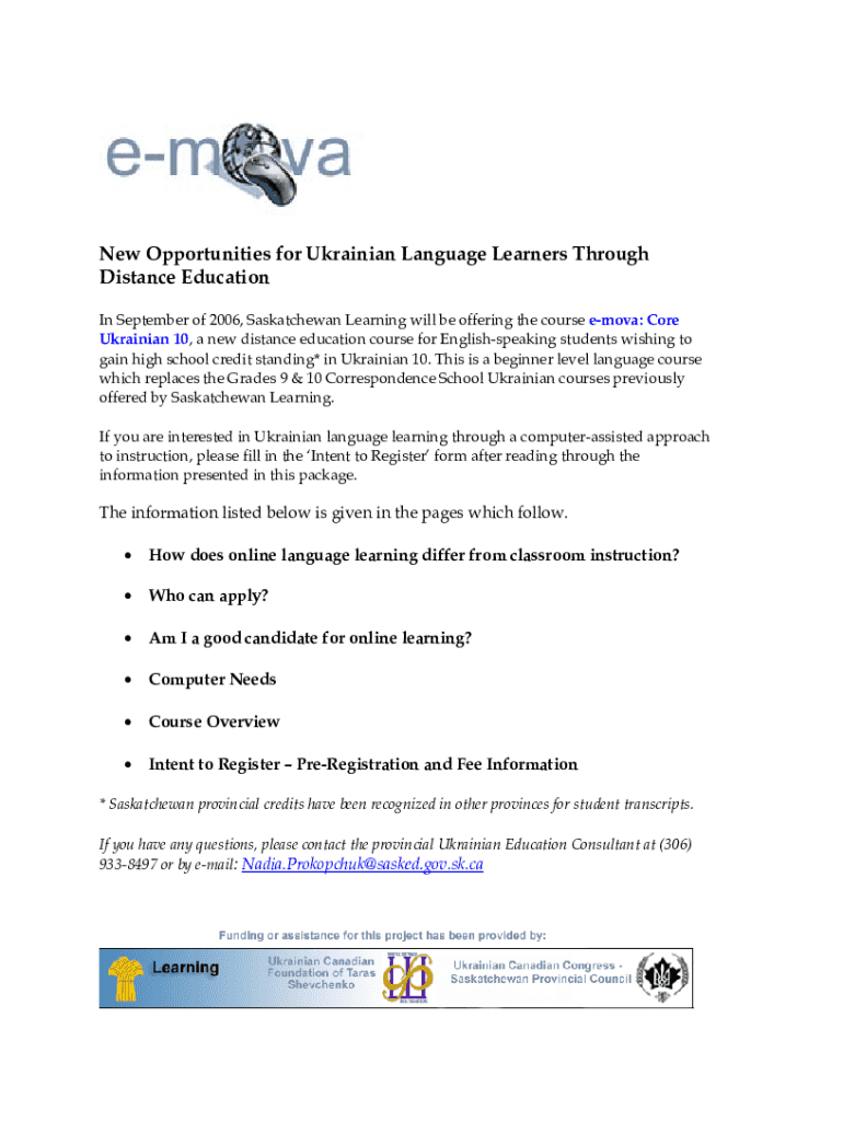 New Opportunities for Ukrainian Language Learners Through Distance Education In September 2006, Saskatchewan Learning will be offering the course em ova: Core Ukrainian 10, a new distance education