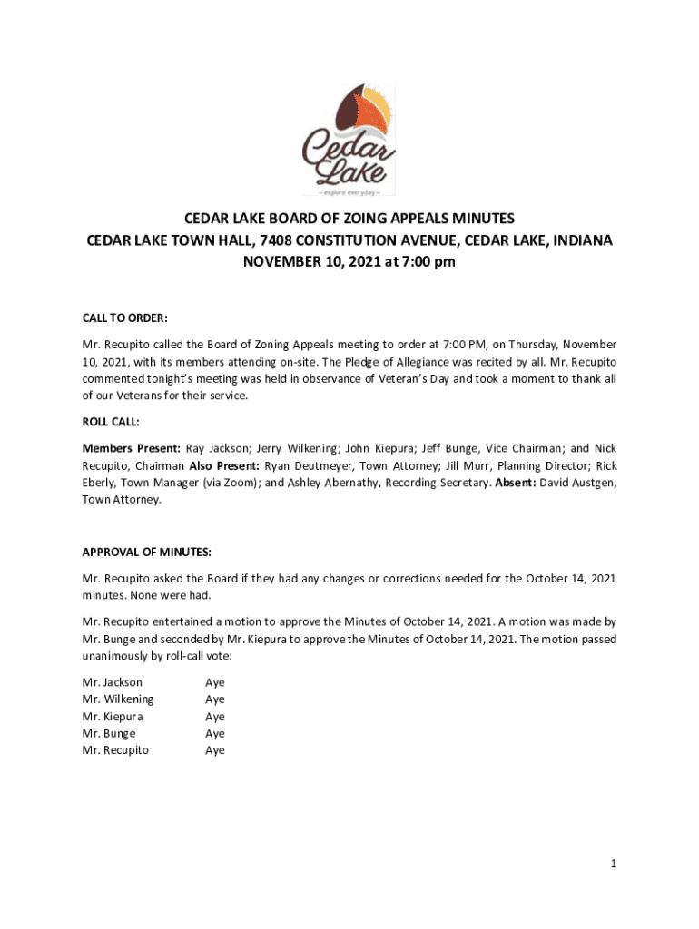 Minutes from the Cedar Lake Board of Zoning Appeals meeting on November 10, 2021, detailing approvals and discussions on variances and developments.