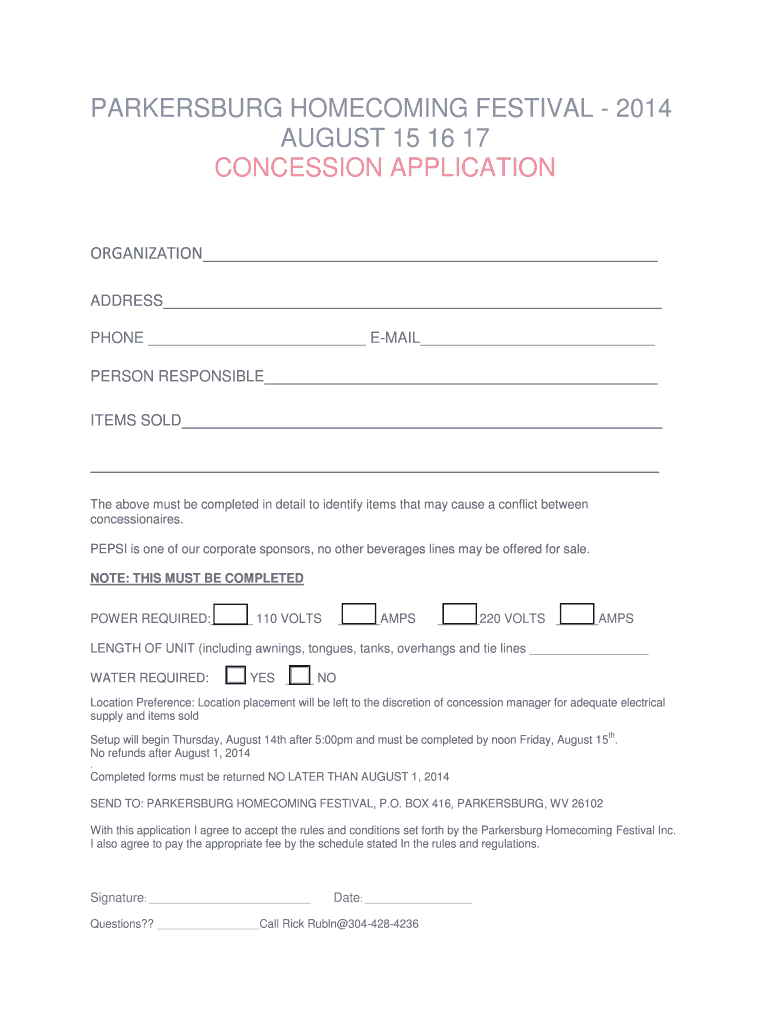 PARKERSBURG HOMECOMING FESTIVAL 2014 AUGUST 15 16 17 CONCESSION APPLICATION ORGANIZATION ADDRESS PHONE E-MAIL PERSON RESPONSIBLE ITEMS SOLD The above must be completed in detail to identify items