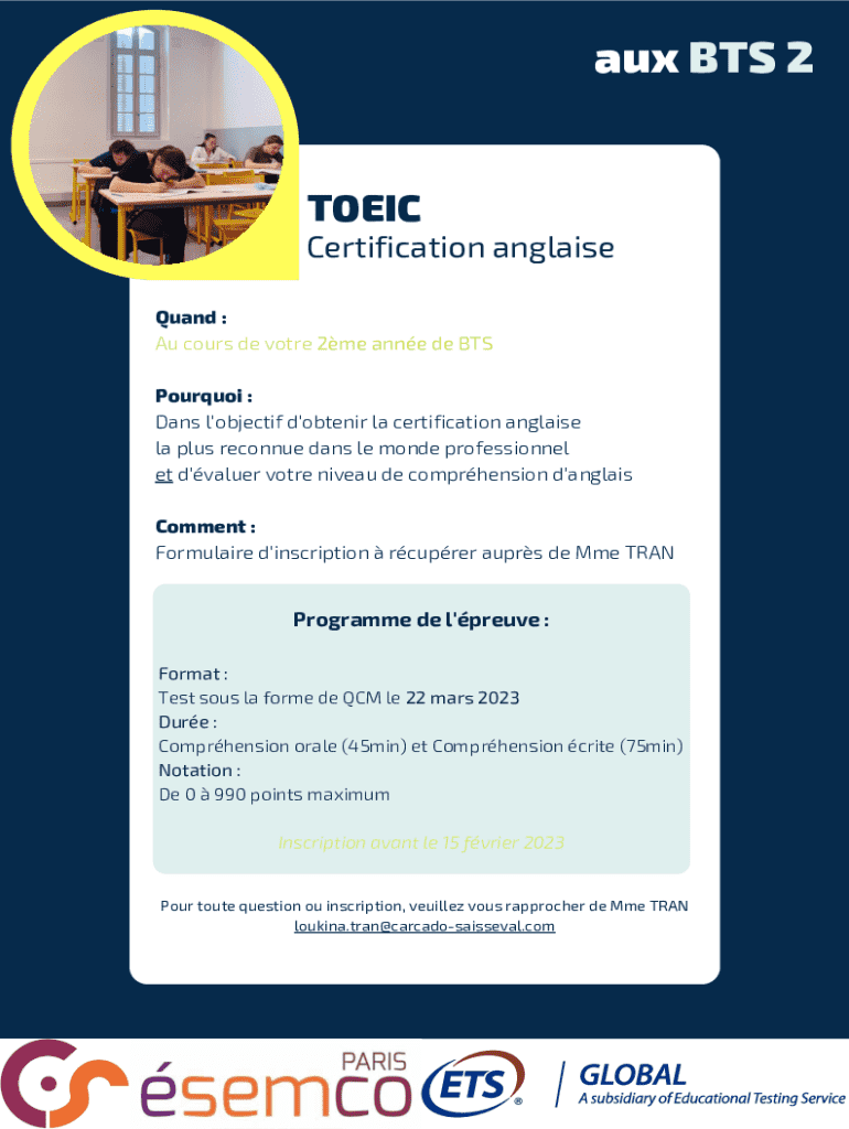 aux BTS 2 TOEICCertification anglaise Quand : Au cours de votre 2me anne de BTS Pourquoi : Dans l\'objectif d\'obtenir la certification anglaise la plus reconnue dans le monde professionnel et d\'valuer