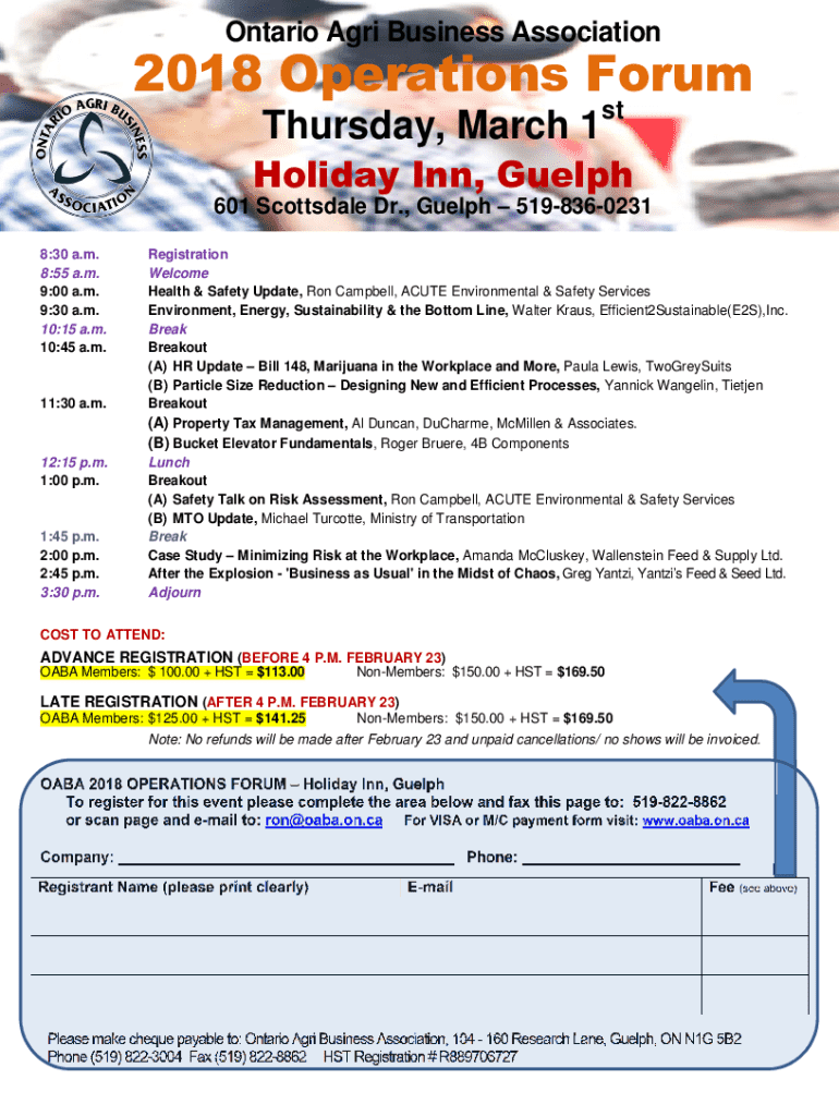 Ontario Agra Business Association2018 Operations Forum Thursday, March 1stHoliday Inn, Guelph 601 Scottsdale Dr., Guelph 5198360231 8:30 a.m. 8:55 a.m. 9:00 a.m. 9:30 a.m. 10:15 a.m. 10:45 a.m.11:30
