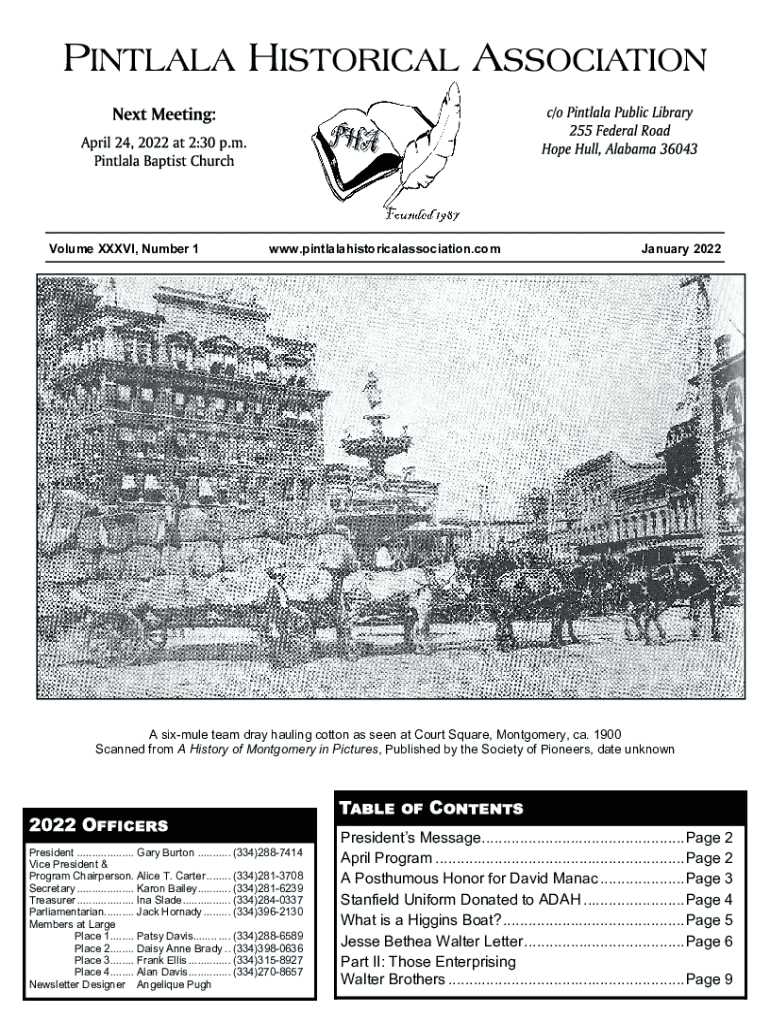 Volume XXXVI, Number 1www.pintlalahistoricalassociation.com January 2022A six mule team dray hauling cotton as seen at Court Square, Montgomery, ca. 1900 Scanned from A History of Montgomery in Pictures,