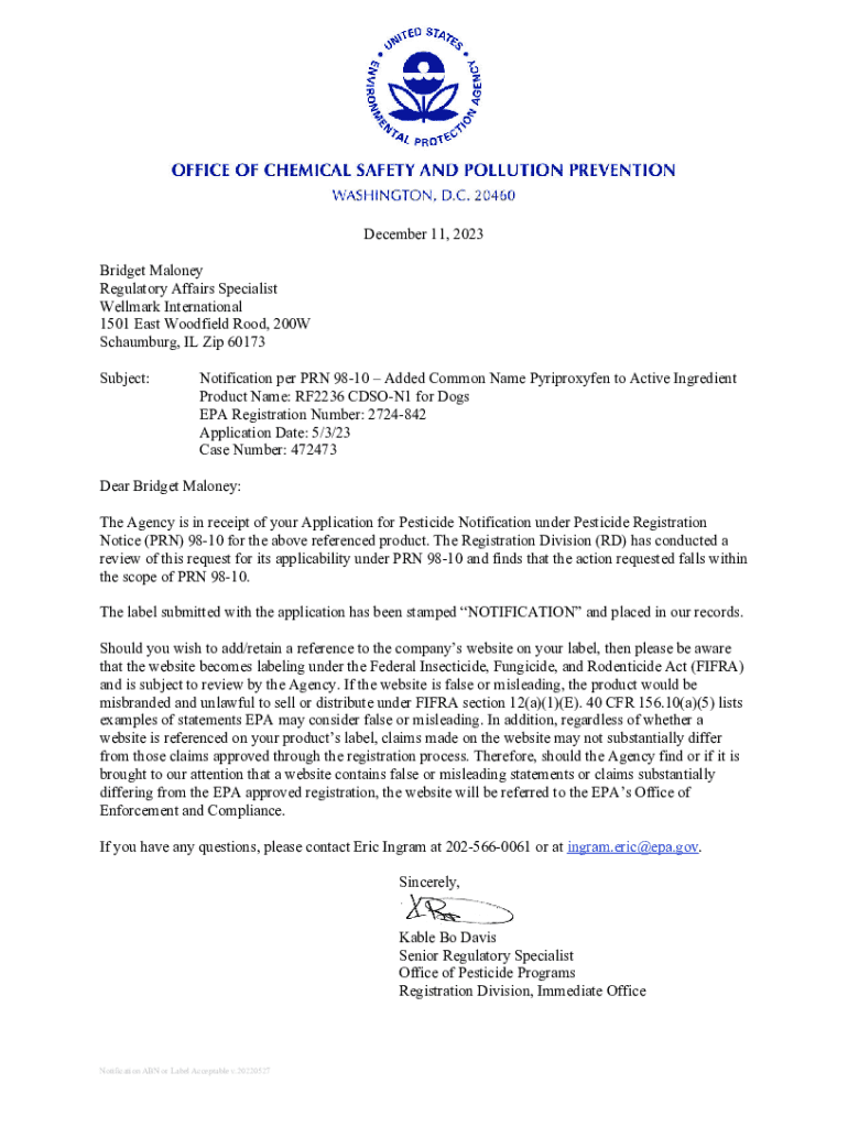 December 11, 2023 Bridget Maloney Regulatory Affairs Specialist Wellmark International 1501 East Woodfield Rood, 200W Schaumburg, IL Zip 60173 Subject:Notification per PRN 9810 Added Common Name Pyriproxyfen