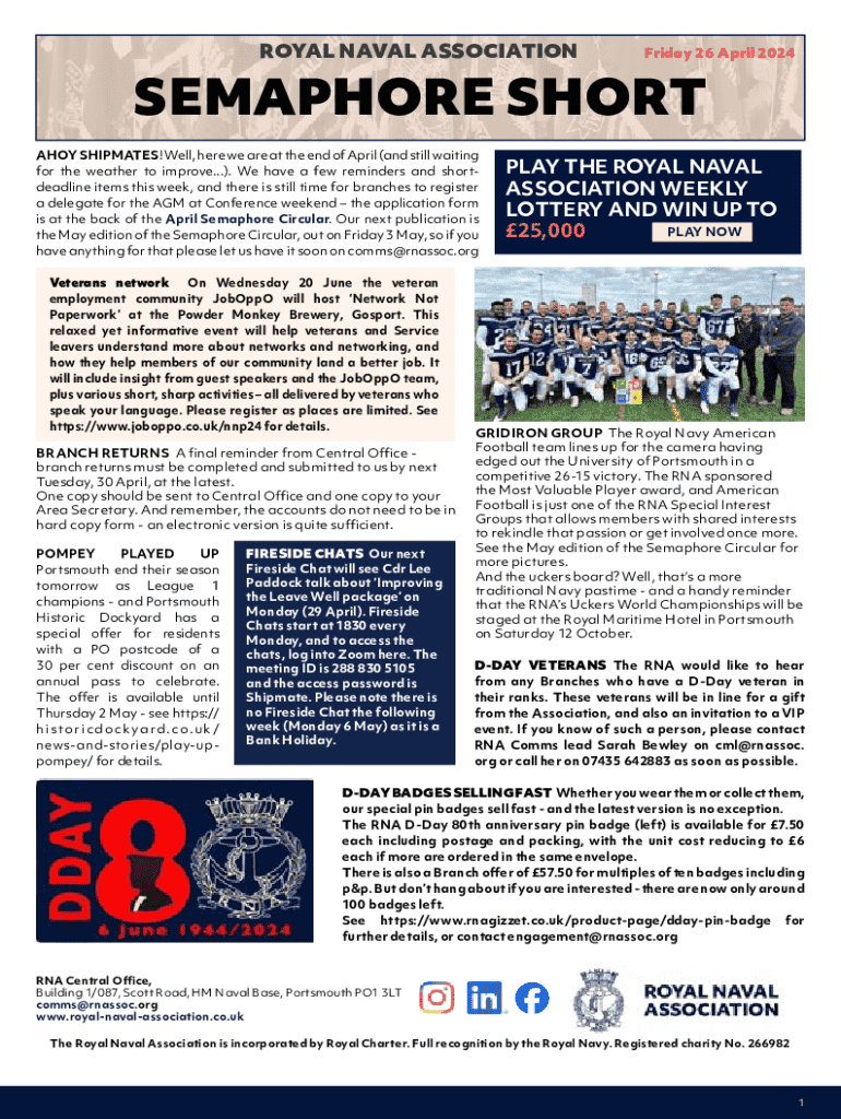 ROYAL NAVAL ASSOCIATIONFriday 26 April 2024SEMAPHORE SHORT AHOY SHIPMATES! Well, here we are at the end of April (and still waiting for the weather to improve...). We have a few reminders and shortdeadline