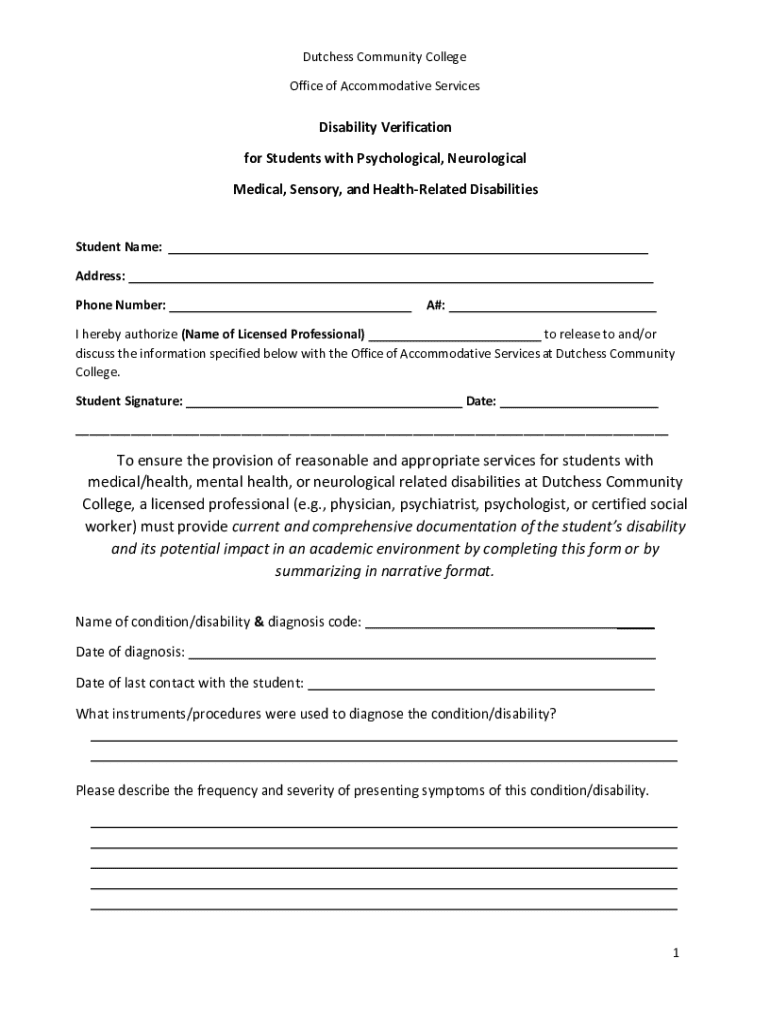 This form is required for students with psychological and health-related disabilities at Duchess Community College to secure necessary academic accommodations.