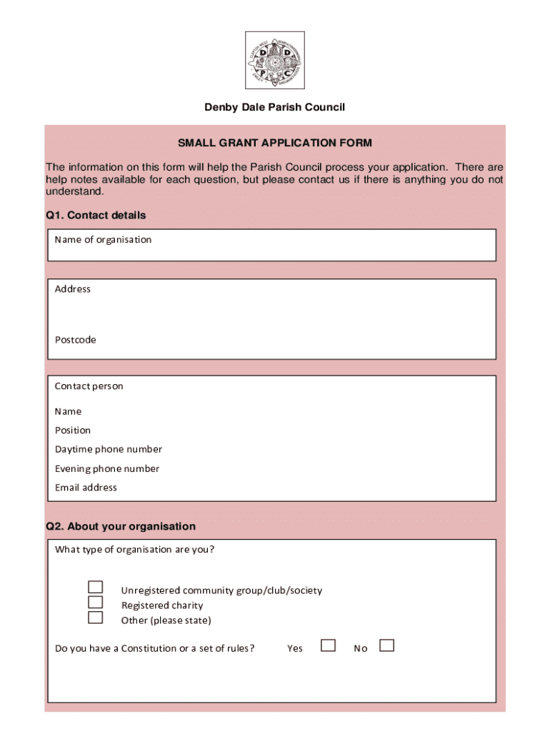 Denby Dale Parish CouncilSMALL GRANT APPLICATION FORM The information on this form will help the Parish Council process your application. There are help notes available for each question, but please