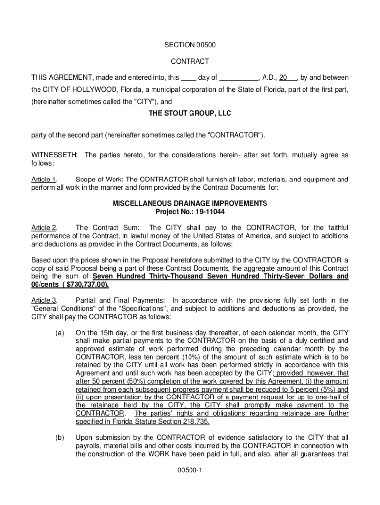 SECTION 00500 CONTRACT THIS AGREEMENT, made and entered into, thisday of, A.D., 20, by and betweenthe CITY OF HOLLYWOOD, Florida, a municipal corporation of the State of Florida, part of the first