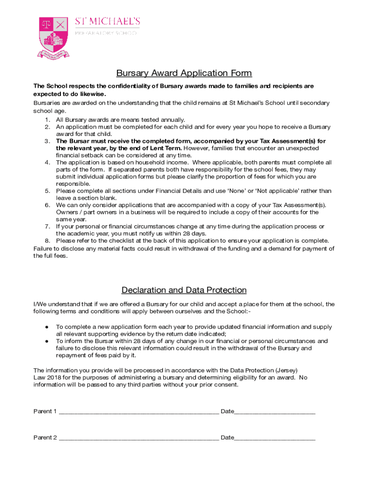 Bursary Award Application Form The School respects the confidentiality of Bursary awards made to families and recipients are expected to do likewise. Bursaries are awarded on the understanding that