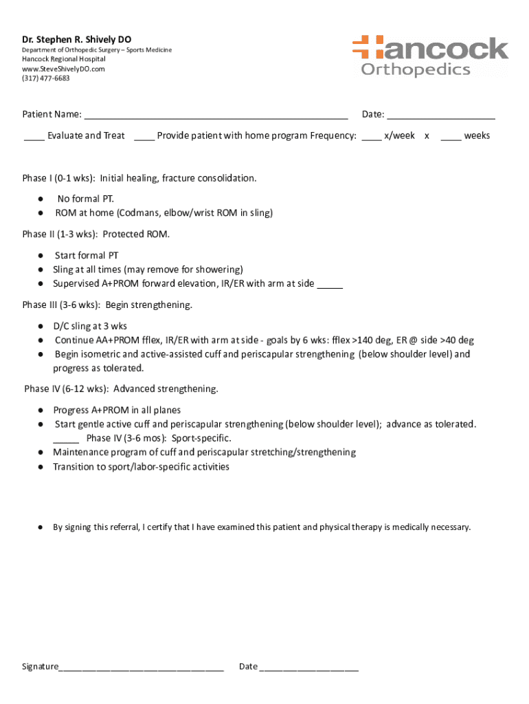 Dr. Stephen R. Shively DO Department of Orthopedic Surgery Sports MedicineHancock Regional Hospital www.SteveShivelyDO.com (317) 4776683Patient Name: ___Date: ______ Evaluate and Treat ___ Provide