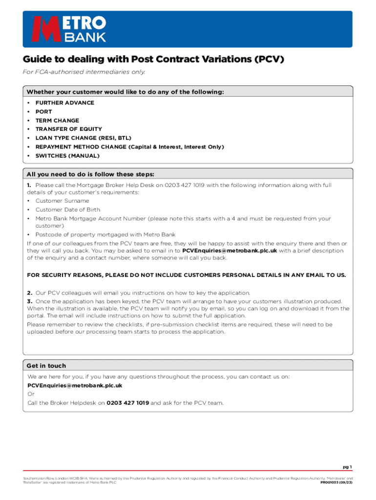Guide to dealing with Post Contract Variations (PCV) For FCAauthorised intermediaries only. Whether your customer would like to do any of the following: FURTHER ADVANCE PORT TERM CHANGE TRANSFER OF