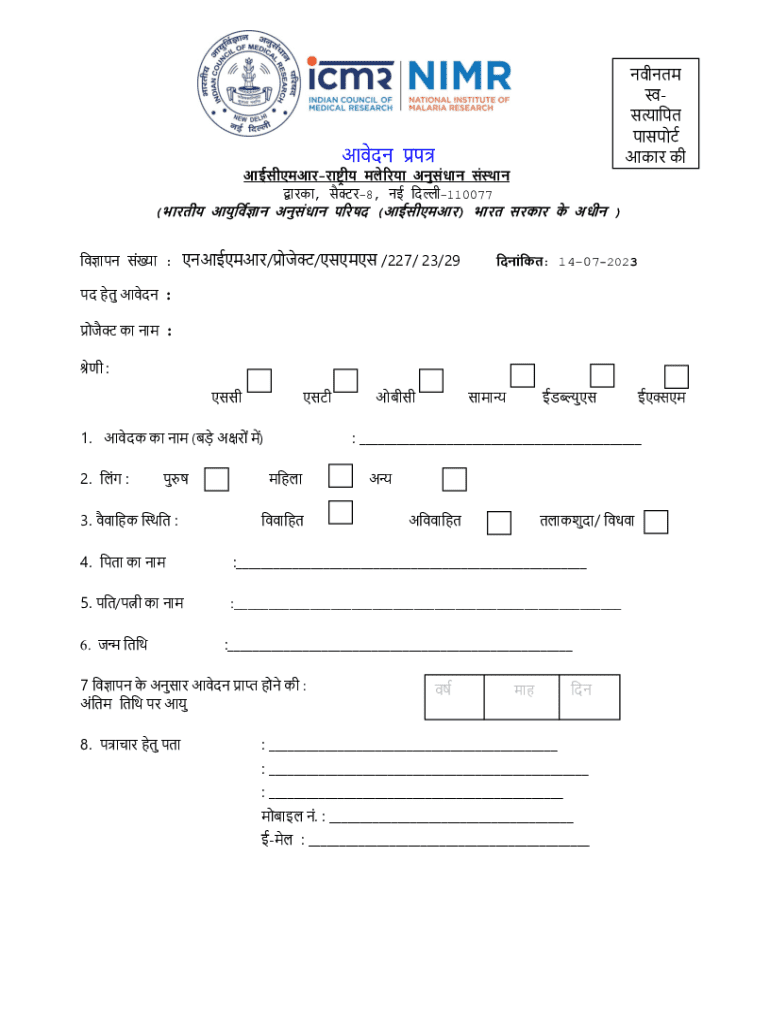 इस आवेदन प्रपत्र में ICMR-राष्ट्रीय मलेरिया अनुसंधान संस्थान में विशेष परियोजना के लिए आवेदन करने के लिए सभी आवश्यक जानकारी शामिल है।
