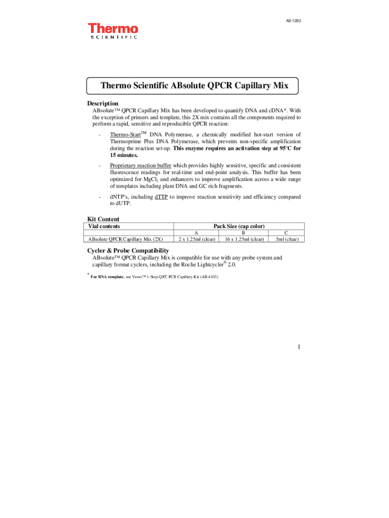 AB1283Thermo Scientific ABsolute QPCR Capillary Mix Description ABsolute QPCR Capillary Mix has been developed to quantify DNA and cDNA*. With the exception of primers and template, this 2X mix contains