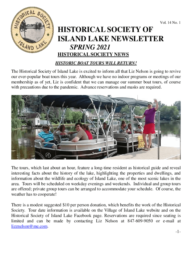 Discover the Spring 2021 edition of the Historical Society of Island Lake newsletter, featuring updates on boat tours and a tribute to former Mayor Alex Schmidt.