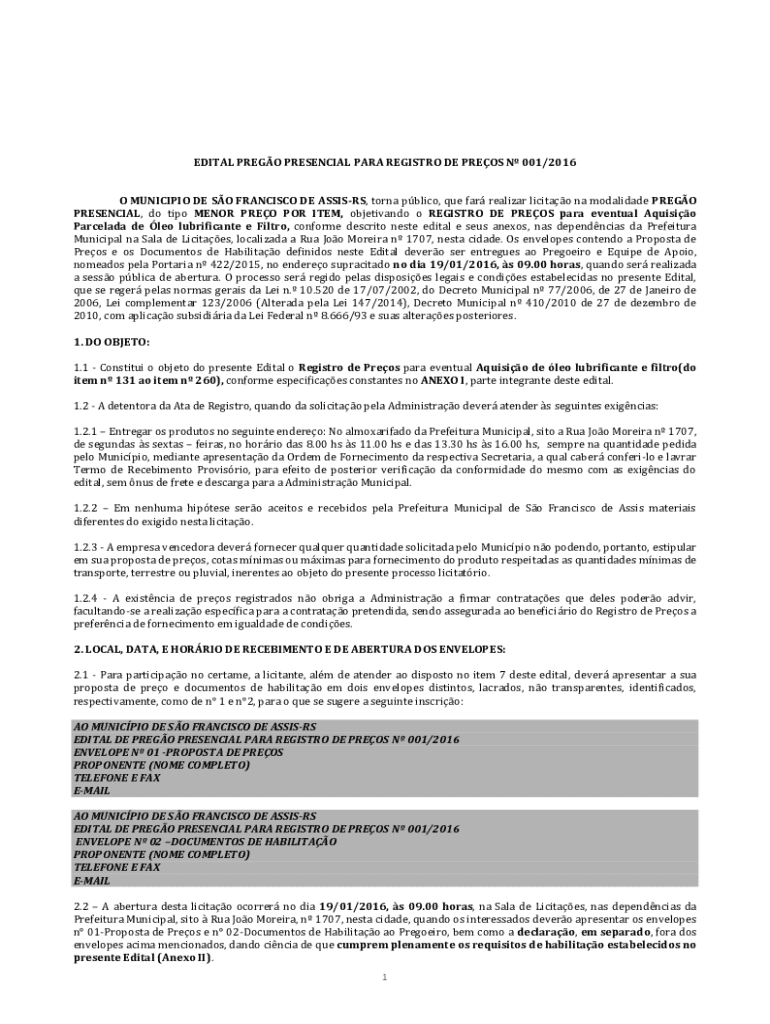 O MUNICIPAL DE SO FRANCISCO DE ASSISTS, torn public, Que far realizer licit Na modalidade PRESO