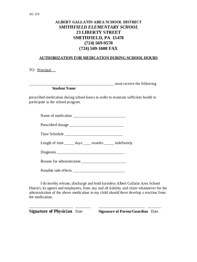 The Authorization for Medication During School Hours is a Word document that should be submitted to the specific address to provide specific information. It must be filled-out and signed, which is possible manually, or with the help of a certain solution such as PDFfiller. This tool helps to fill out any PDF or Word document directly from your browser (no software requred), customize it depending on your needs and put a legally-binding electronic signature. Once after completion, you can send the Authorization for Medication During School Hours to the appropriate recipient, or multiple recipients via email or fax. The editable template is printable too because of PDFfiller feature and options proposed for printing out adjustment. In both digital and in hard copy, your form will have a neat and professional appearance. You can also save it as the template to use later, so you don't need to create a new document from scratch. You need just to customize the ready template.