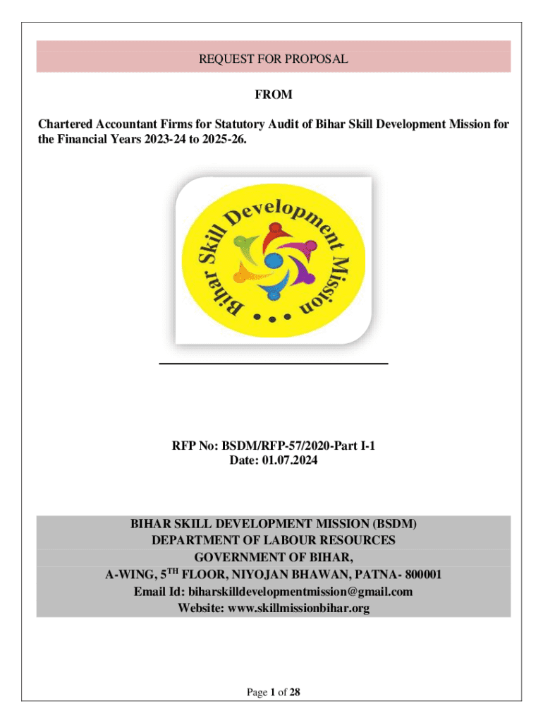 REQUEST FOR PROPOSAL FROM Chartered Accountant Firms for Statutory Audit of Bihar Skill Development Mission for the Financial Years 202324 to 202526.RFP No: BSDM/RFP57/2020Part I1 Date: 01.07.2024BIHAR
