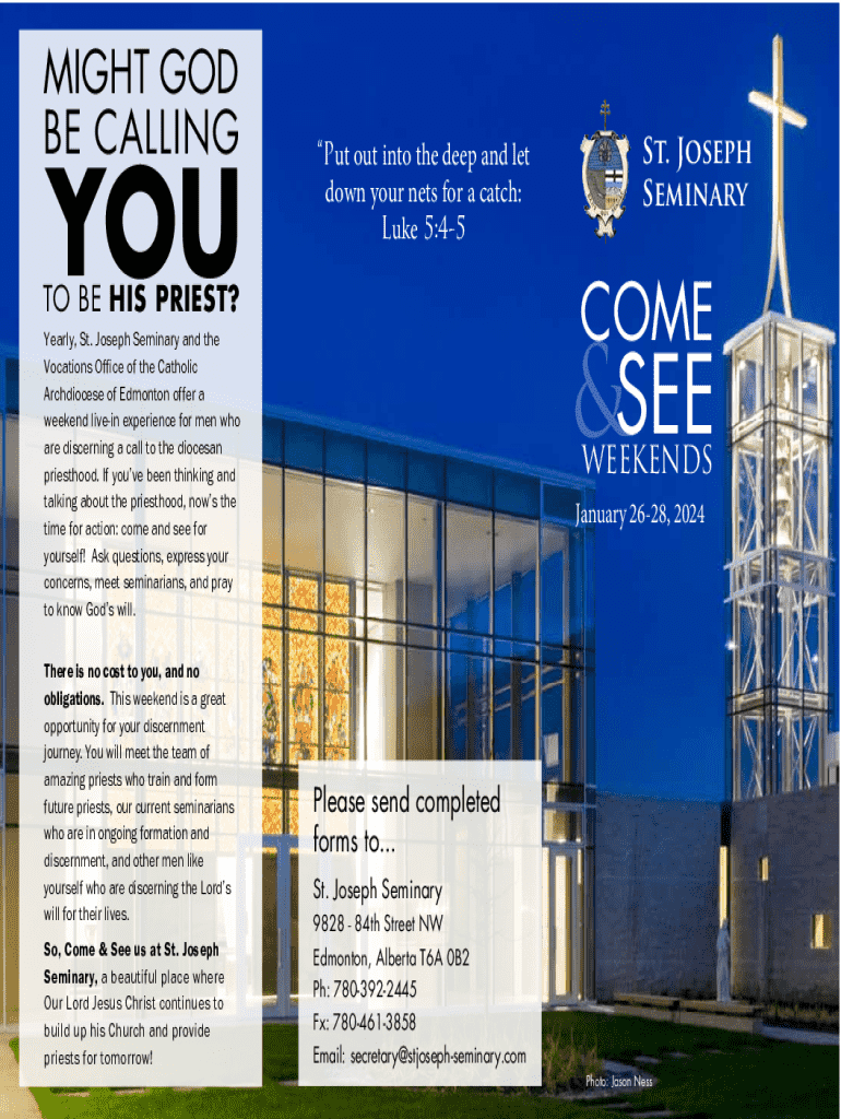 Join St. Joseph Seminary\'s \'Come and See\' weekend from January 26-28, 2024. Engage with current seminarians and explore your call to the priesthood.