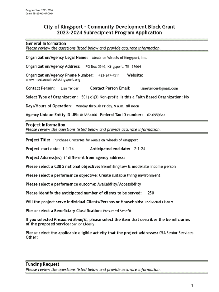 Program Year 20232024 Grant #B23MC470004City of Kingsport Community Development Block Grant 20232024 Subrecipient Program Application General InformationPlease review the questions listed below and