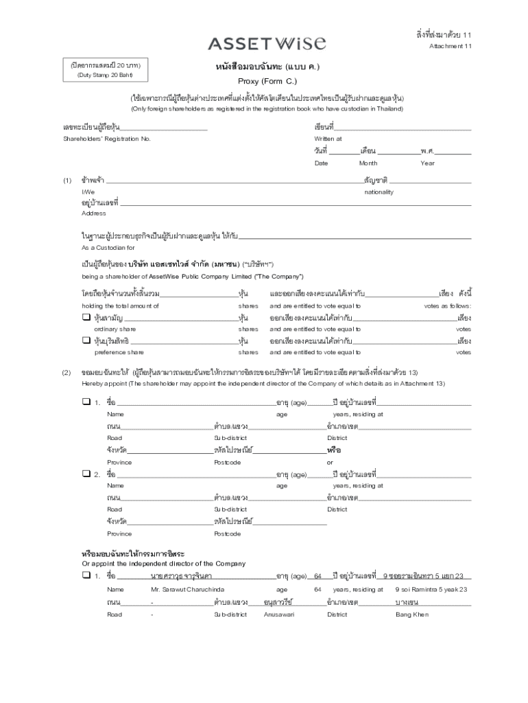 This document serves as a Proxy Form C for shareholders of Asset Wise Public Company Limited to authorize a representative for the 2023 AGM.