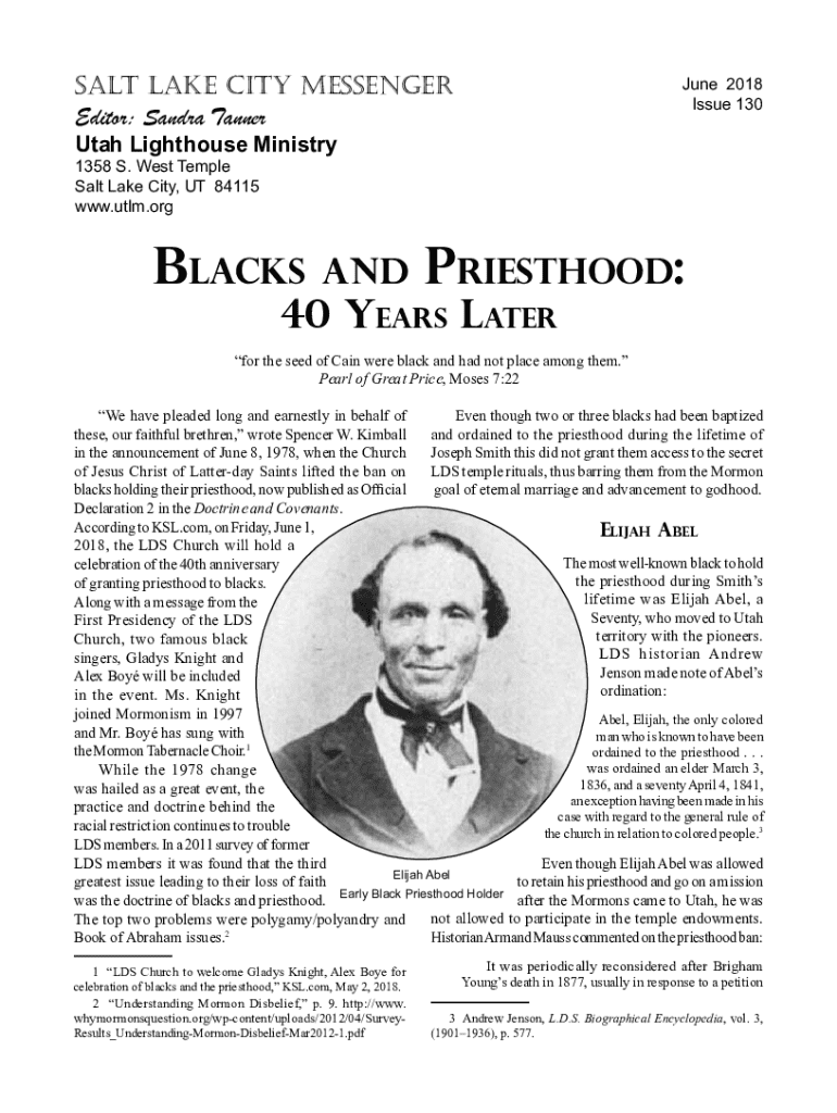 salt lake city messenger Editor: Sandra TannerJune 2018 Issue 130Utah Lighthouse Ministry 1358 S. West Temple Salt Lake City, UT 84115 www.utlm.orgBlacksandPriesthood:40 Years Laterfor the seed of Cain were black and had not place among them. Pearl of Great Price, Moses 7:22 We have pleaded long and earnestly in behalf of Even though two or three blacks had been baptized these, our faithful brethren, wrote Spencer W. Kimball and ordained to the priesthood during the lifetime
