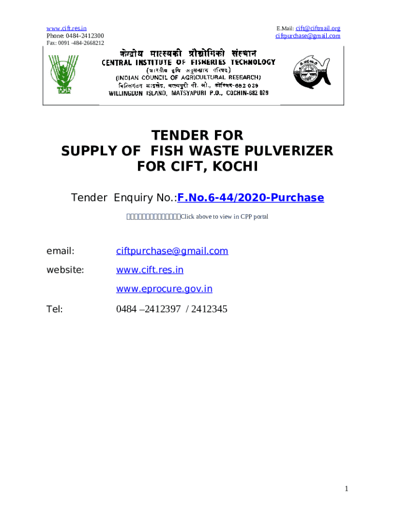 What is Tender for the supply of fish Waste Grinder for cIFT, kochi ... - cift res Form?