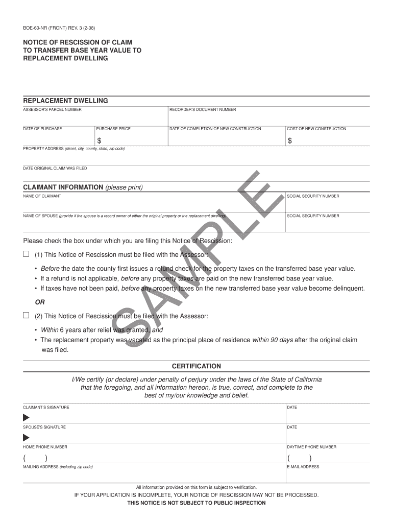 BOE60NR (FRONT) REV. 3 (208) NOTICE OF RESCISSION OF CLAIM TO TRANSFER BASE YEAR VALUE TO REPLACEMENT DWELLING ASSESSORS PARCEL NUMBER DATE OF PURCHASE RECORDERS DOCUMENT NUMBER PURCHASE PRICE DATE