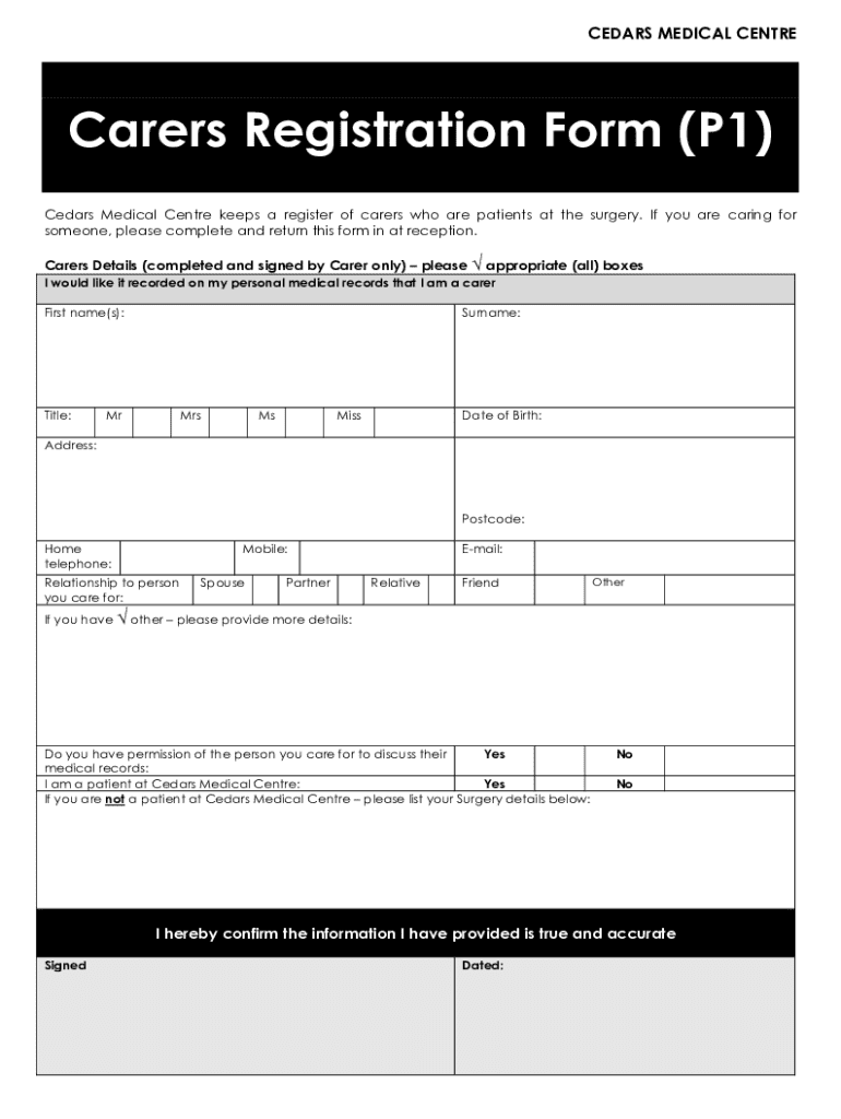 CEDARS MEDICAL CENTRECarers Registration Form (P1)