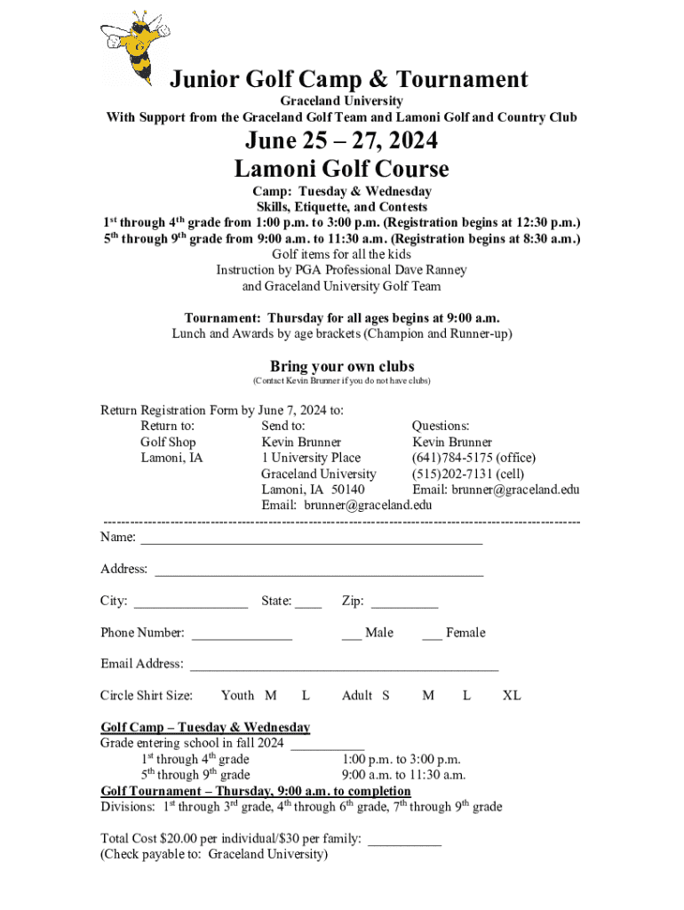 Join the Junior Golf Camp & Tournament at Graceland University from June 25-27, 2024. Register now for skills, contests, and PGA instruction!