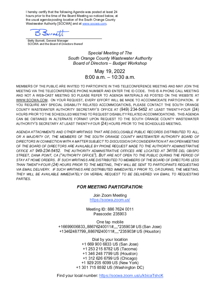 I hereby certify that the following Agenda was posted at least 24 hours prior to the time of the Board Meeting so noticed below, at the usual agenda posting location of the South Orange County Wastewater Authority [SOCWA] and at www.socwa.com.Betty Burnett, General Manager SOCWA and the Board of Directors thereofSpecial Meeting of The South Orange County Wastewater Authority Board of Directors Budget WorkshopMay 19, 2022 8:00 a.m. 10:30 a.m. MEMBERS OF THE PUBLIC ARE INVITED TO PARTICIPATE