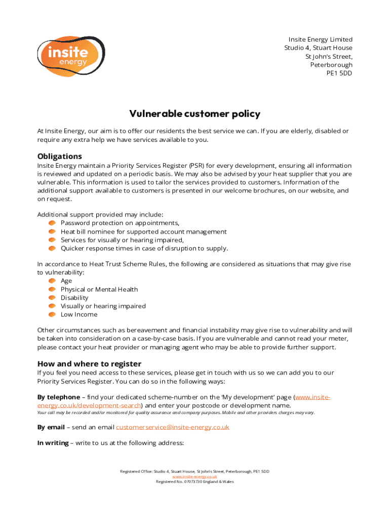 Insight Energy Limited Studio 4, Stuart House St Johns Street, Peterborough PE1 5DDVulnerable customer policy At Insight Energy, our aim is to offer our residents the best service we can. If you are