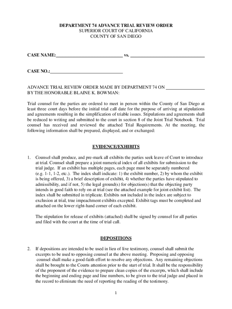 This document outlines the requirements for trial preparation and procedures for the Advance Trial Review Order from the Superior Court of California, ensuring compliance by counsel.