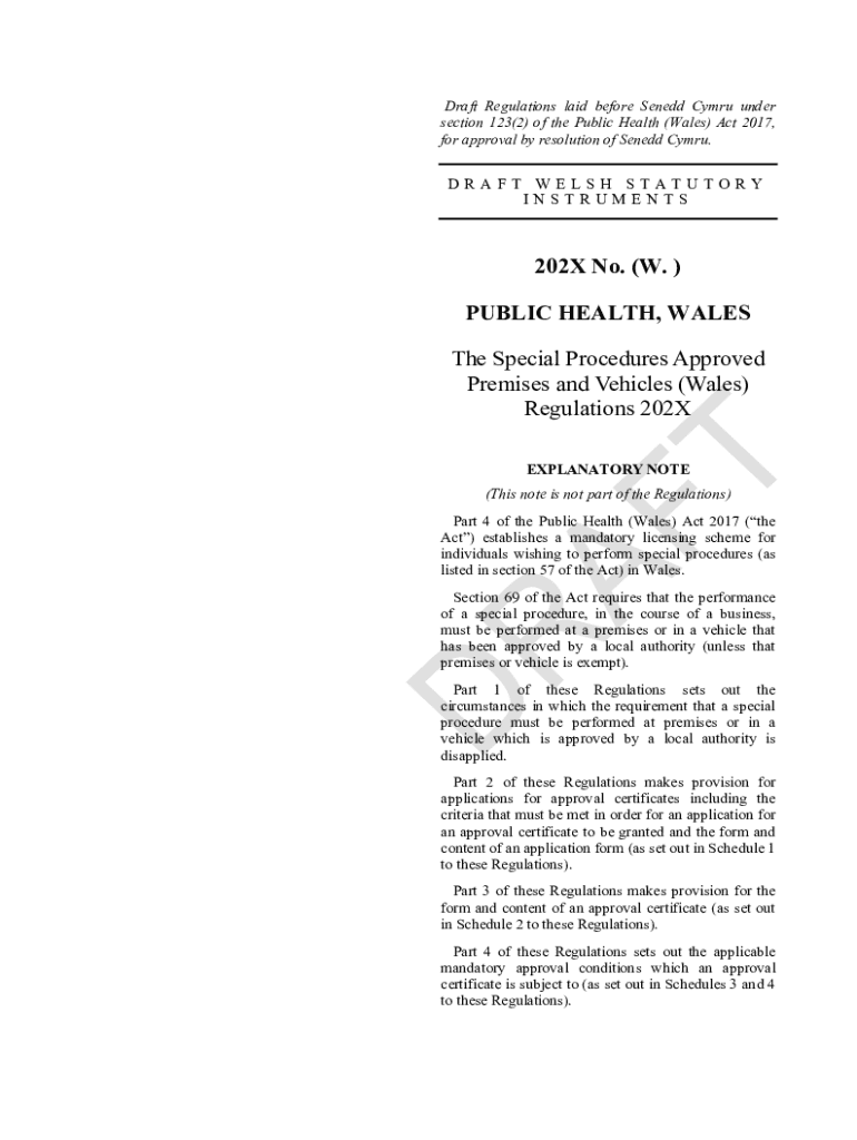 This document outlines the Special Procedures Regulations in Wales, ensuring health safety standards for approved premises and vehicles performing special procedures in compliance with the Public Health Act 2017.