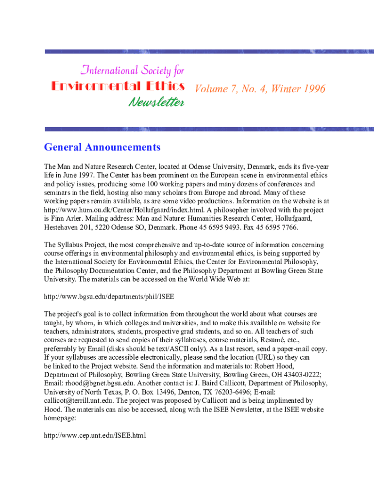 Volume 7, No. 4, Winter 1996General Announcements The Man and Nature Research Center, located at Odense University, Denmark, ends its fiveyear life in June 1997. The Center has been prominent on the European scene in environmental ethics and policy issues, producing some 100 working papers and many dozens of conferences and seminars in the field, hosting also many scholars from Europe and abroad. Many of these working papers remain available, as are some video productions. Information on the...