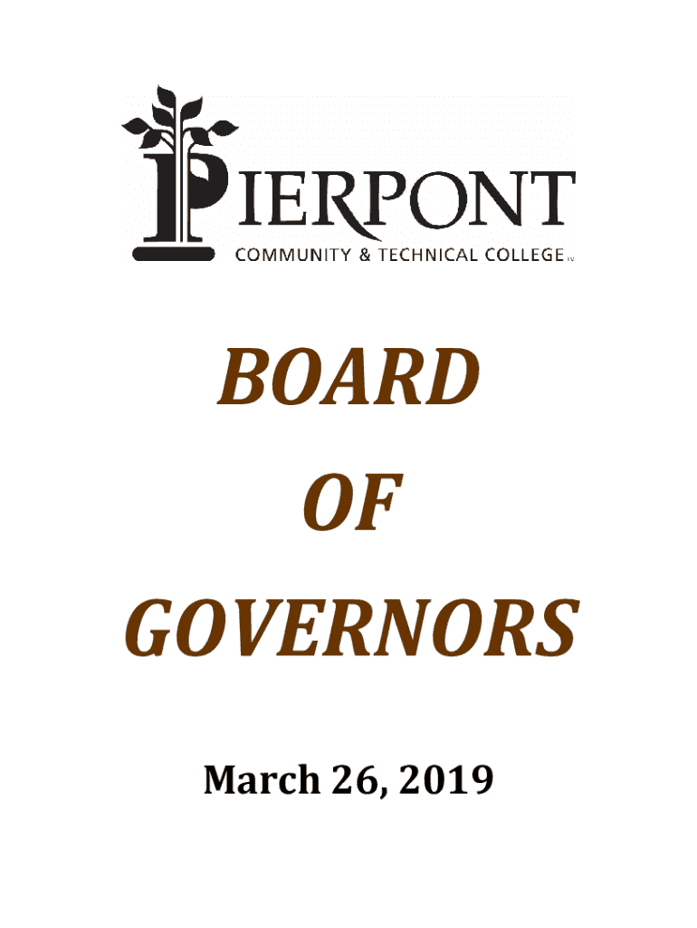 BOARD OF GOVERNORS March 26, 2019MEETING SCHEDULEPIERPONT COMMUNITY & TECHNICAL COLLEGE BOARD OF GOVERNORS March 26, 2019 Pierpont Advanced Technology Center, Room 216 A 500 Galliher Drive, Fairmont, WV1:00 PMATC Advisory Board Committee Meeting Pierpont Advanced Technology Center, Room 216 ASharon Shaffer Chairwoman Thomas Barlow Vice Chair Brian Bozarth Recording SecretaryWilliam Blandino, Memori Dobbs, Holly C. Kauffman, Linda King, Rick Pruitte, Larry Puccio, Jr., Natalie Stone, Warren...