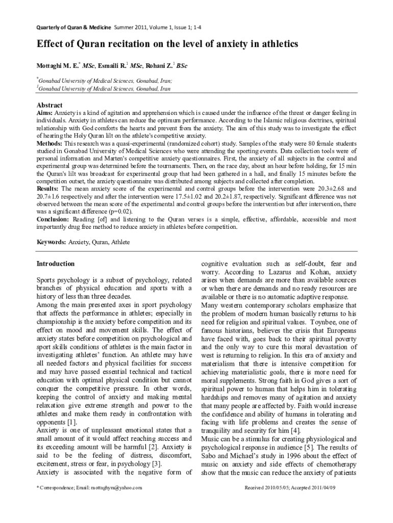 Quarterly of Quran & Medicine Summer 2011, Volume 1, Issue 1; 14Effect of Quran recitation on the level of anxiety in athletics